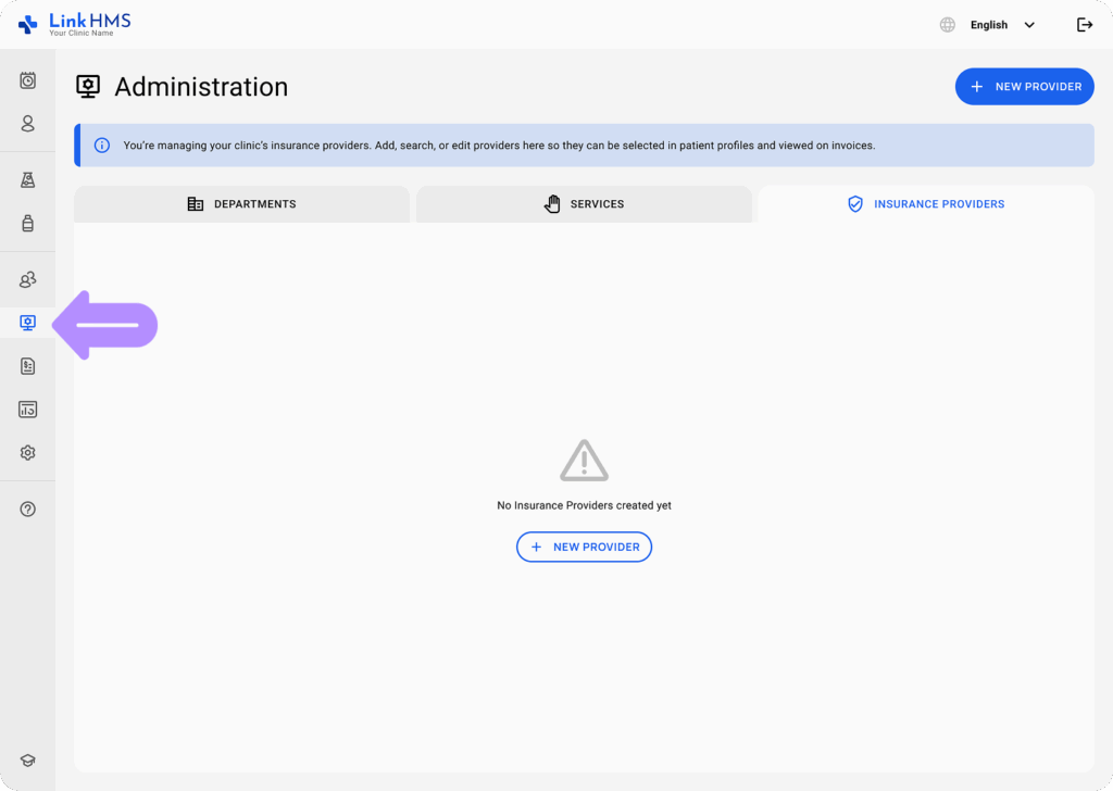 The Administration module also includes the Insurance Providers tab to easily manage insurer-related data and add new providers.