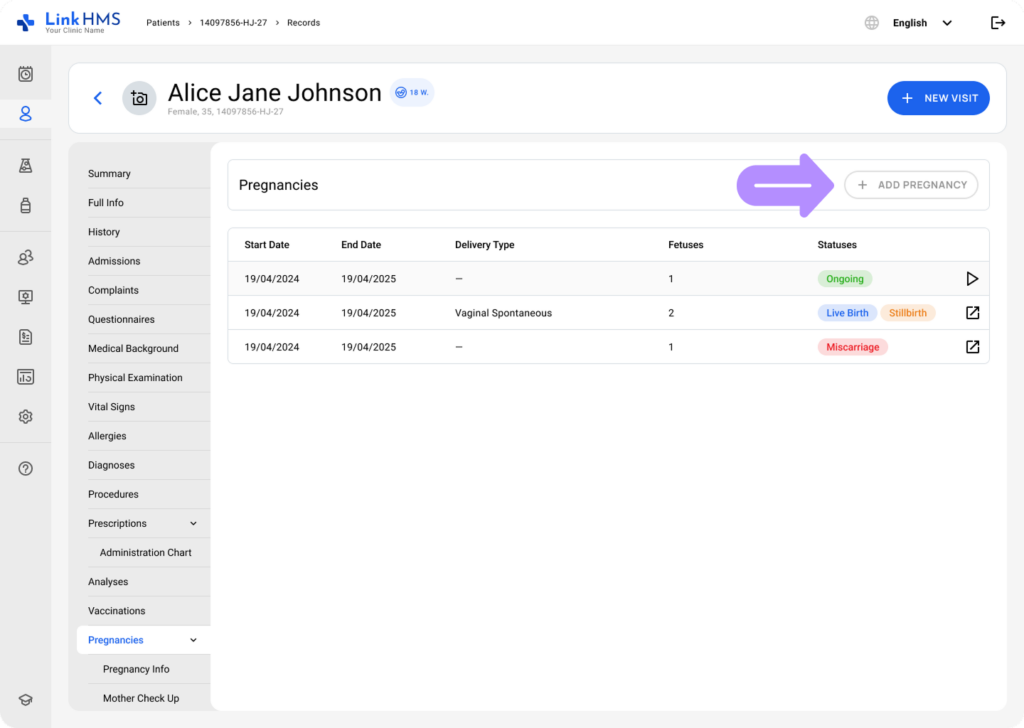 If the patient already has an ongoing pregnancy, the Add Pregnancy button is not activated. There is no option to add a second pregnancy. In that case, you add records inside the existing pregnancy record.