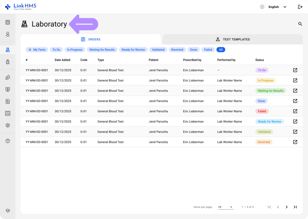 - If you need to update the test status, navigate to the Laboratory tab from the left-side menu.
