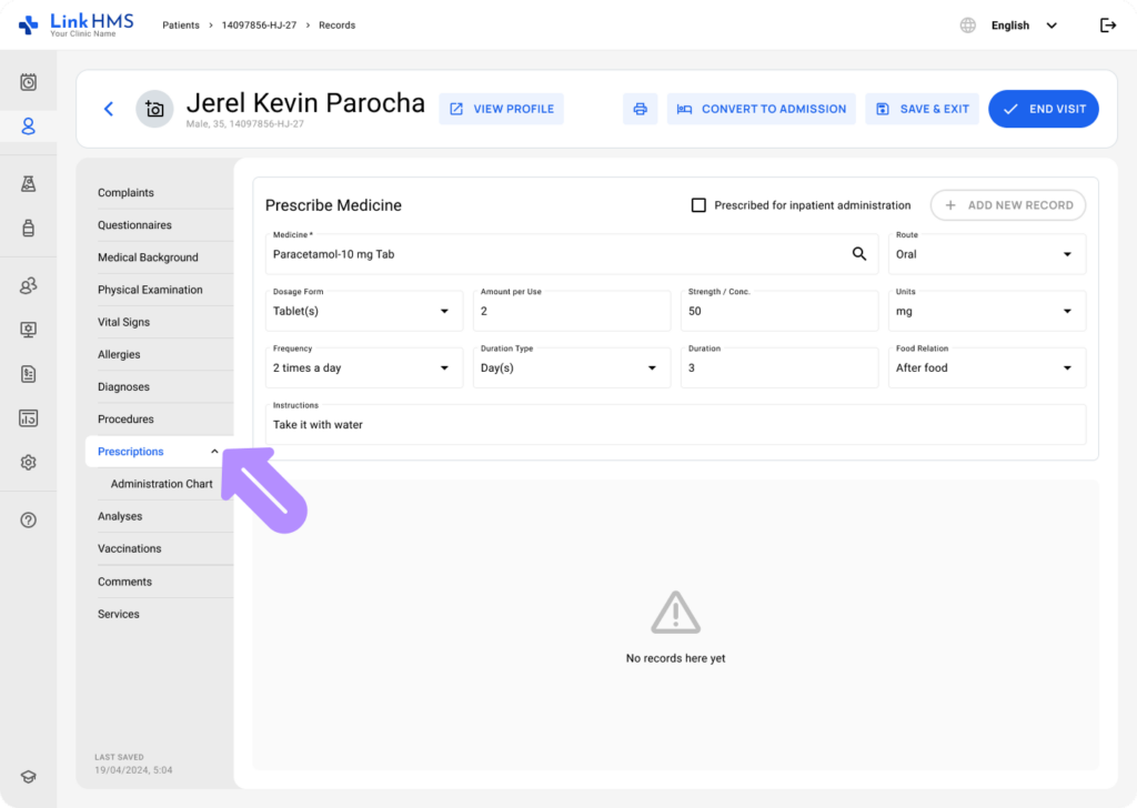 - Navigate to the administration chart from the patient’s profile, or open it directly through the active admission or visit in the Prescription tabs.