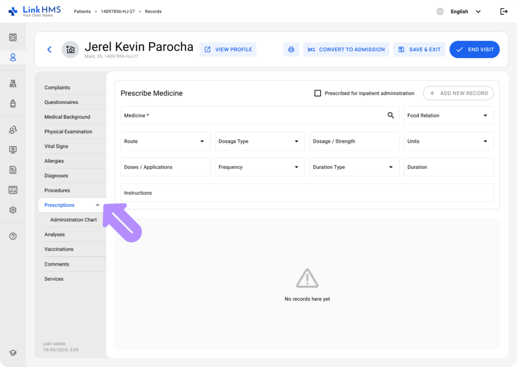 When making a prescription in LinkHMS, you can select if the medication needs to be shown in the administration chart for dose administration tracking. See the steps below to mark a medication for inpatient administration. For the full prescription workflow, refer to the detailed guide on How to make a prescription here.