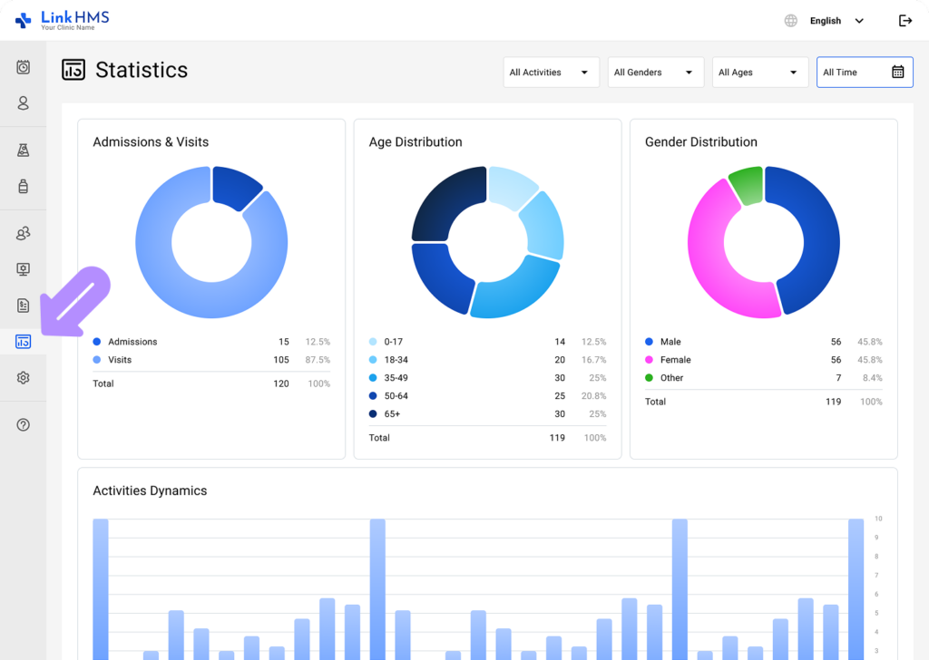 The Statistics section provides a visual overview of your clinic data. It helps you monitor trends and understand patient activities and demographics through interactive charts and reports.